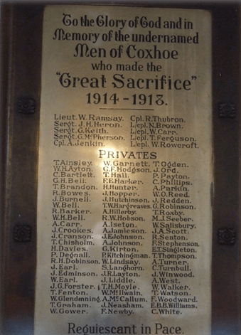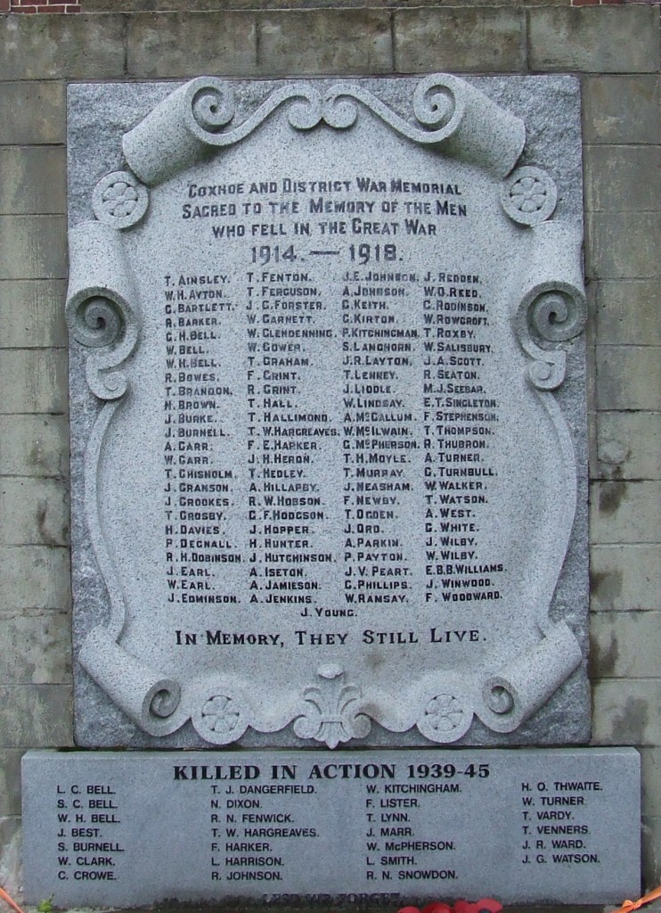 Coxhoe men, along with every other community in the country did not shirk their sense of duty when it came to stepping forward to fight injustice and aid those less able. At the end of the war, Coxhoe like every other community in the nation paid the ultimate sacrifice. Mothers lost sons, sisters lost brothers, wives lost husbands and children lost fathers. Families were deprived of loved ones and the community lost a generation.