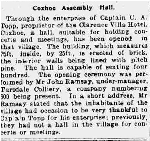 In March 1899, Captain Carl August Topp, a Dane by birth but a naturalised British subject was living in the Clarence Villa Hotel and tendering for a firm to construct an Assembly Hall in Coxhoe.