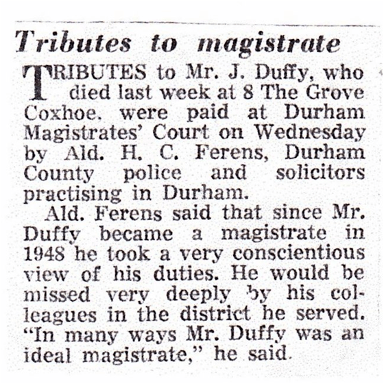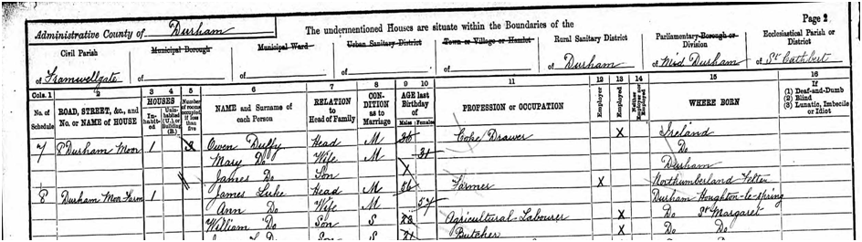 Owen Duffy was employed as a coke drawer in a local colliery in Durham and lived in Durham Moor Houses which was a part of the Township of Framwellgate Moor.