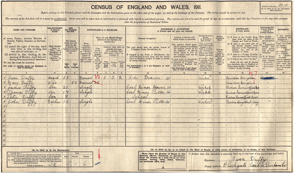 The three men of the household, father Owen and sons James and Thomas were all employed in the coal mining industry, whilst Peter was still at school. Nephew John, 18 years of age, who was living with the Duffy’s was also working in the coalmines.