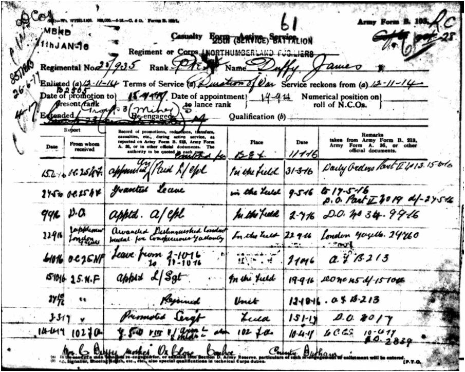 After a short period of leave in early October 1916, upon his return to his battalion Acting Corporal Duffy was appointed to the rank of Lance Sergeant, which is effectively a corporal acting in the rank of Sergeant.