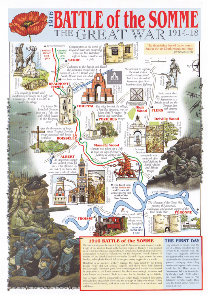 Having held the line in the Armentieres area the 103 Infantry Brigade with the Tyneside Irish battalions moved up to the Somme in early May 1916 and after arriving in Amiens after a 10 hour train journey were faced with a 12 mile march to occupy the trenches in front of Ovillers and La Boiselle, in an area known as the Tara and Usna redoubts which were longside the road from Albert to Bapaume.