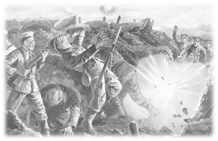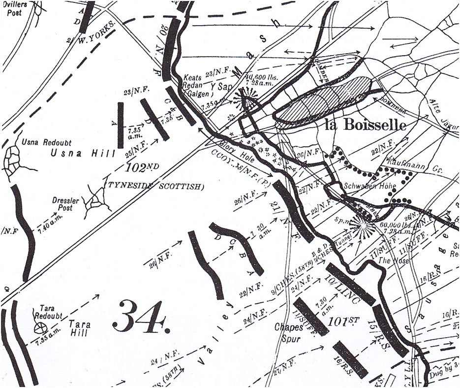 At 7.35 a.m. The 103rd Brigade of 4 battalions of Tyneside Irish, 24th ,25th ,26th ,& 27th left their trenches and advanced towards the German defences and the Y-Sap crater, created when the mine was blown at 7.28 a.m. two minutes before zero hour.