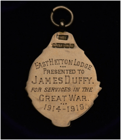 On Wednesday night last the Wesleyan Schoolroom, Coxhoe, was packed by an enthusiastic gathering, when presentations were made by Coxhoe Soldiers and Sailors’ Welcome Home Fund to soldiers belonging to the village, in recognition of their services in their country’s cause. Mr WH Denison, QH, chairman of the fund, presided, and the presentations were made by the Rev. Father Sheehan, CC., West Cornforth. The first of the recipients was Sergt. James Duffy, DCM, NF, who was presented with a silver luminous wrist watch. On returning to his civilian employment at East Hetton Colliery James deeds would be further recognised when he was presented with a gold medal by the East Hetton Lodge of the Durham Miners Association in recognition of his Services during the Great War 1914 -19. Pictured below with James son Tommy proudly holding it