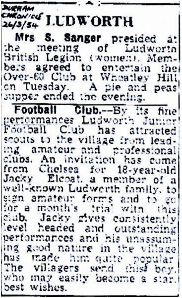 At 18 years, when playing for Ludworth juniors he went for trials with Chelsea for whom he subsequently signed Amateur forms and lived in London. This proved difficult as he wasn’t a member of the clique of southern lads (“they hardly ever passed the ball to me in matches”, says Jack). His father brought him home!.