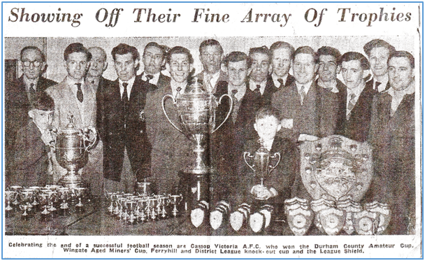 Front row – left to right : Wingate Aged Miners’ Cup / Ferryhill League Cup / Ferryhill District League Shield – won by Cassop for 3rd consecutive year