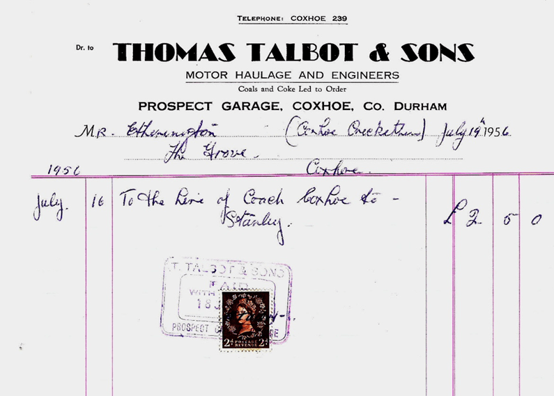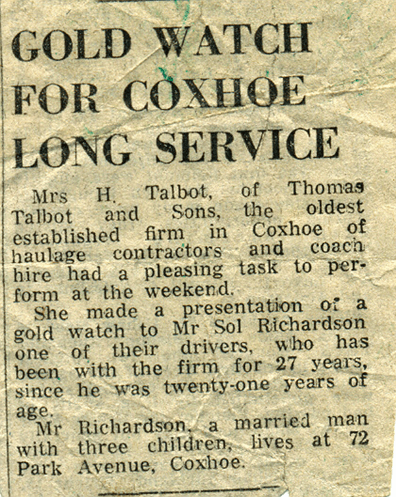 Talbots began as hauliers, became engineers and expanded to provide a wide range of transport needs in the Coxhoe area. In the process they provided a good and friendly service at reasonable prices and employed local people for well over 60 years. Over the years the company transported many people from Coxhoe and district on short and long tours throughout the country including visits to South Shields, Redcar, weekends at Blackpool, weeks at Torquay and London visits.